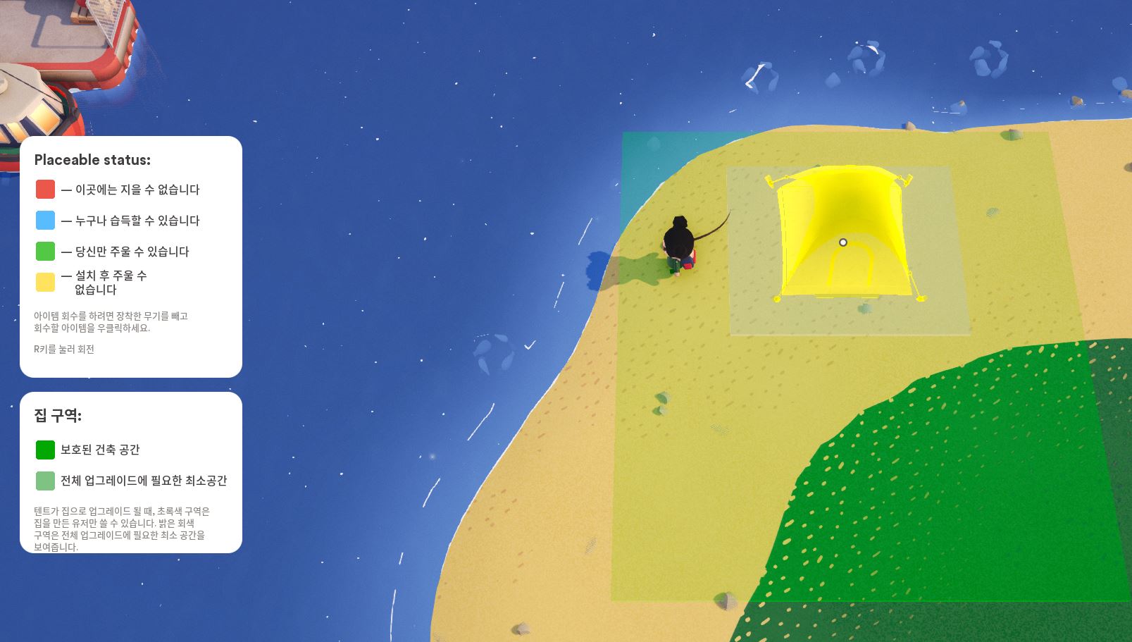 빨간 표시는 지을 수 없다는 표시고요, 노란색 표시가 뜰 때 놓으면 텐트가 지어집니다.