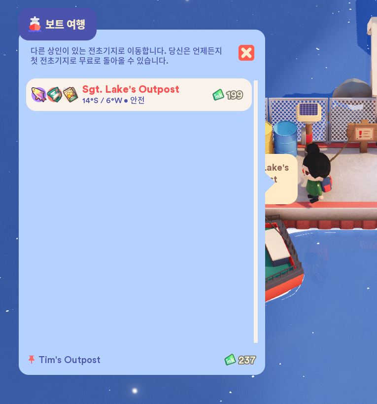 Sgt. Lake's Outpost에 가서 텐트를 구입해야 하기 때문에 초반에 빨간 자판기에 가서 낚싯대를 구입하고 열심히 낚시를 해서 다른 항구로 갈 수 있는 돈을 모아줍니다.